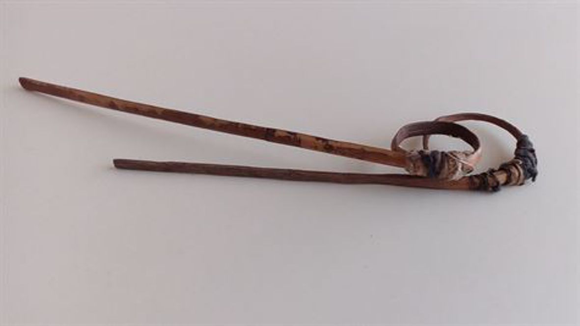 The dulcimer is sturdily built, quite plain and a number of the bridges are missing. It seems to have had four strings per course and perhaps just 16 bridges, so quite a small model. A pair of very mismatched canes have also survived. As Alfred was a carpenter, it’s very possible he built the dulcimer himself.