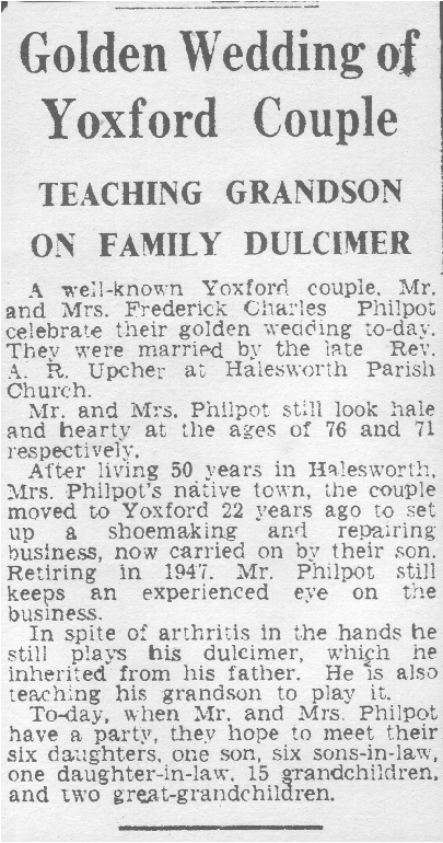 By the age of 14 Charlie was employed as a baker’s boy – he may well have been working for William Chilvers junior, who ran a bakery in Chediston Street between 1881 and 1895) and whose father had made the dulcimer owned by the Philpot family! By 1901 he was working as a boot riveter, continuing in the shoe trade for the rest of his life. In 1903 he married Ada Johnson and by 1911 they had started what was to become a large family and were still living in Chediston Street. Charlie’s trade came in useful during the First World War, keeping him away from the frontline, mending soldiers’ boots. In 1921 he and his growing family were still on Chediston Street, but later in the 1920s the family moved to Yoxford, where they had a shoe shop at the front of Veranda House, with living quarters at the back. Charlie certainly made up for being an only child himself by having ten children, out of which nine were girls!