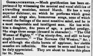 The dulcimer was a popular instrument for travelling musicians, and one such, a Mr. March was much praised in a newspaper report from 1844. His visit to Godmanchester (Huntingdonshire, now Cambridgeshire) had been much appreciated, and he was bound for St Neots next – there is no indication where he came from or what sort of locations/events he and his daughter performed at, but interestingly, “he has a very superior dulcimer” according to the writer! Genealogical investigations have not been able to identify this person.