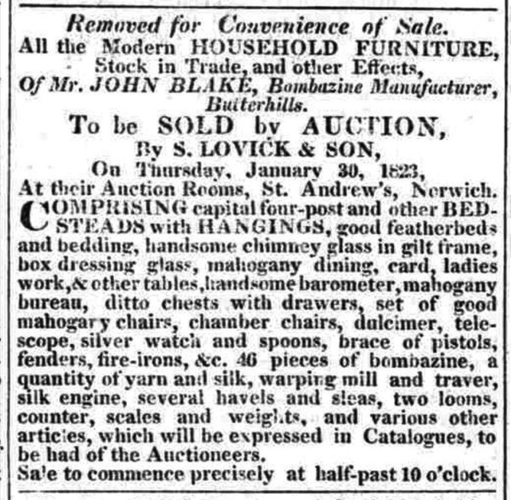 In January 1823, the effects of Mr John Blake, manufacturer of bombazine (a textile) were advertised as being for sale at Lovick’s auction rooms, St Andrew’s, Norwich. The items included a barometer, a silver watch and a dulcimer, as well as looms and other weaving equipment, so Mr Blake was evidently a man of some wealth. Whether he had died or gone bankrupt is not clear, and genealogical records have not yet been of any help.