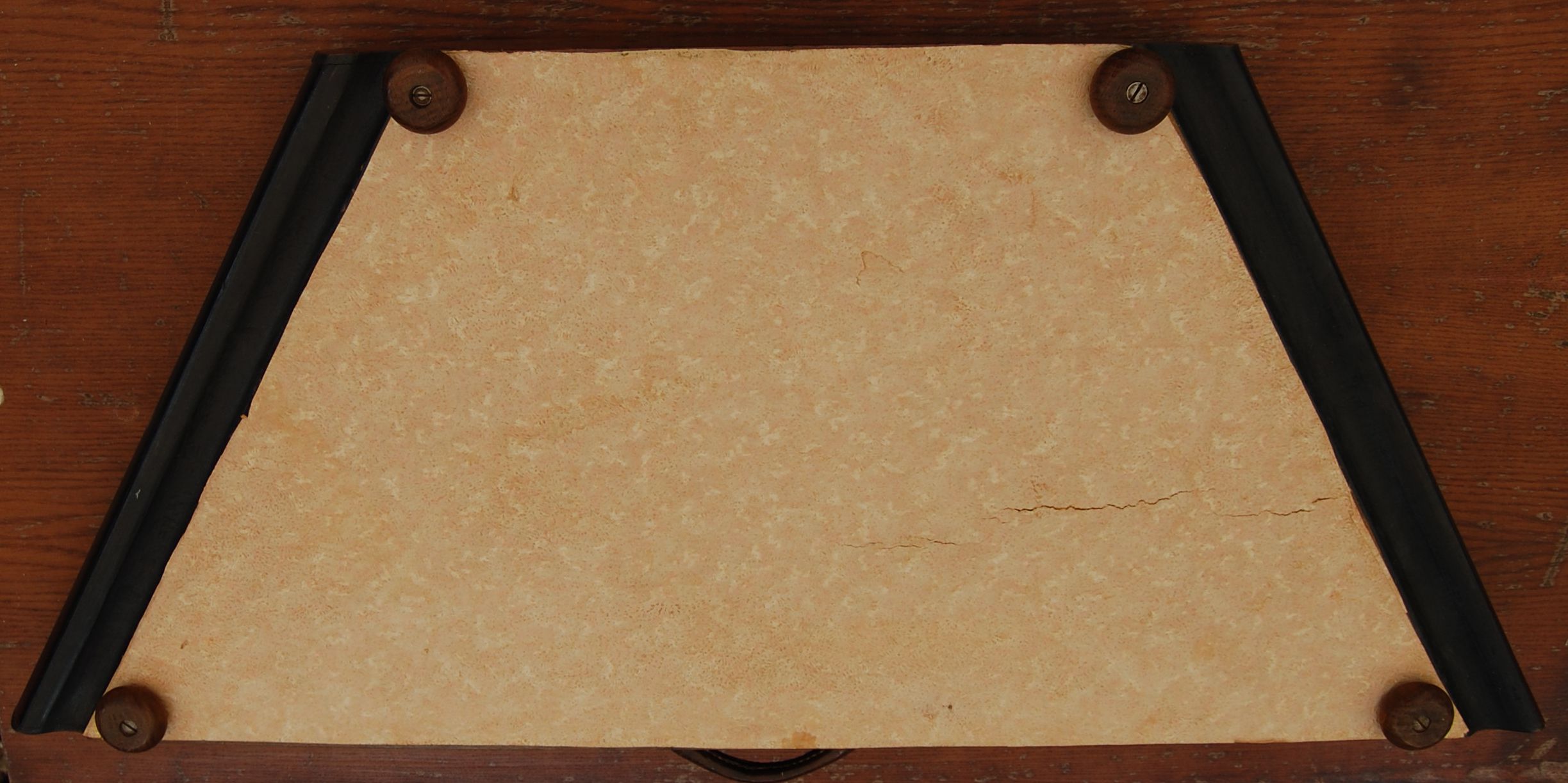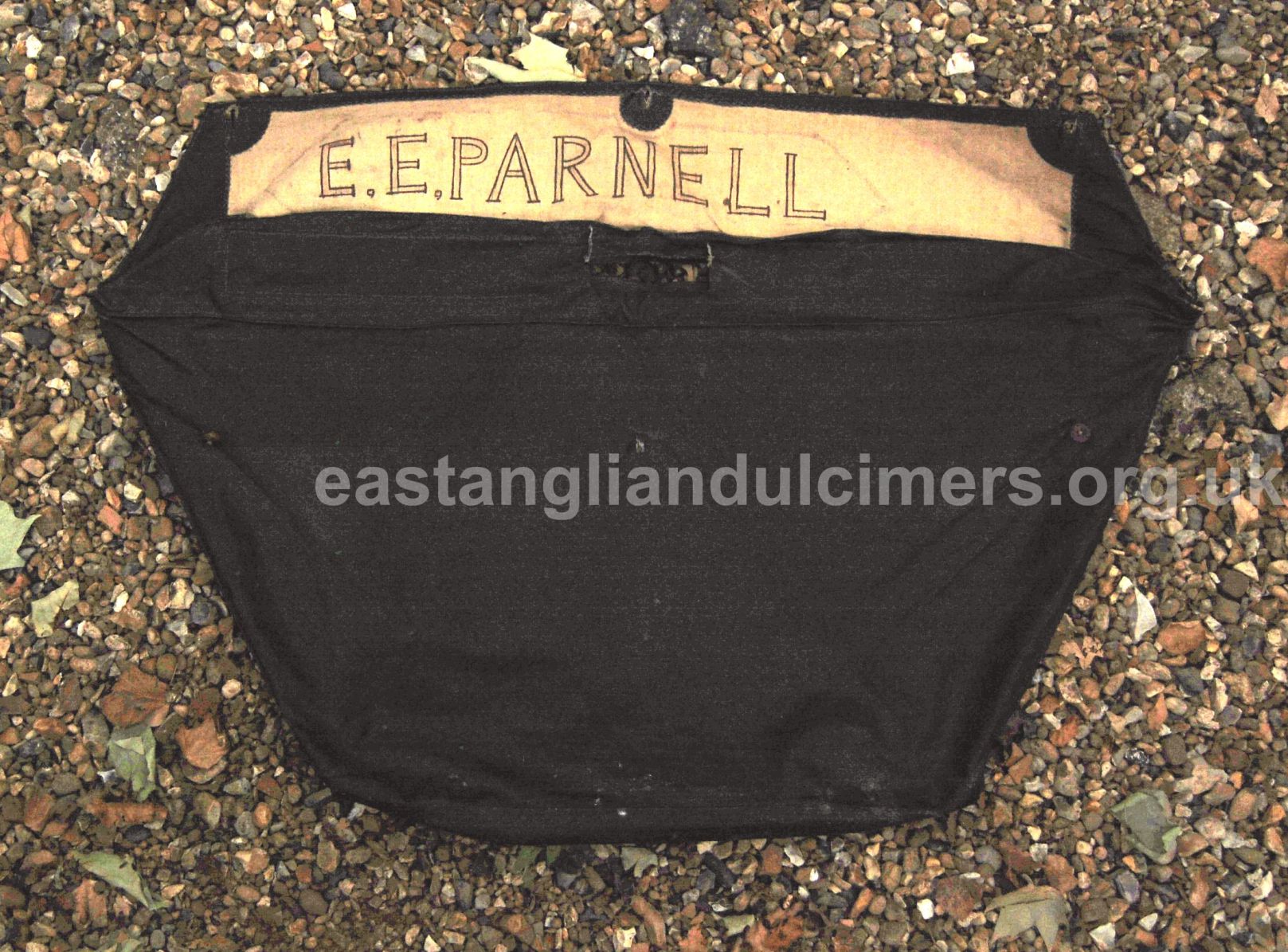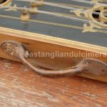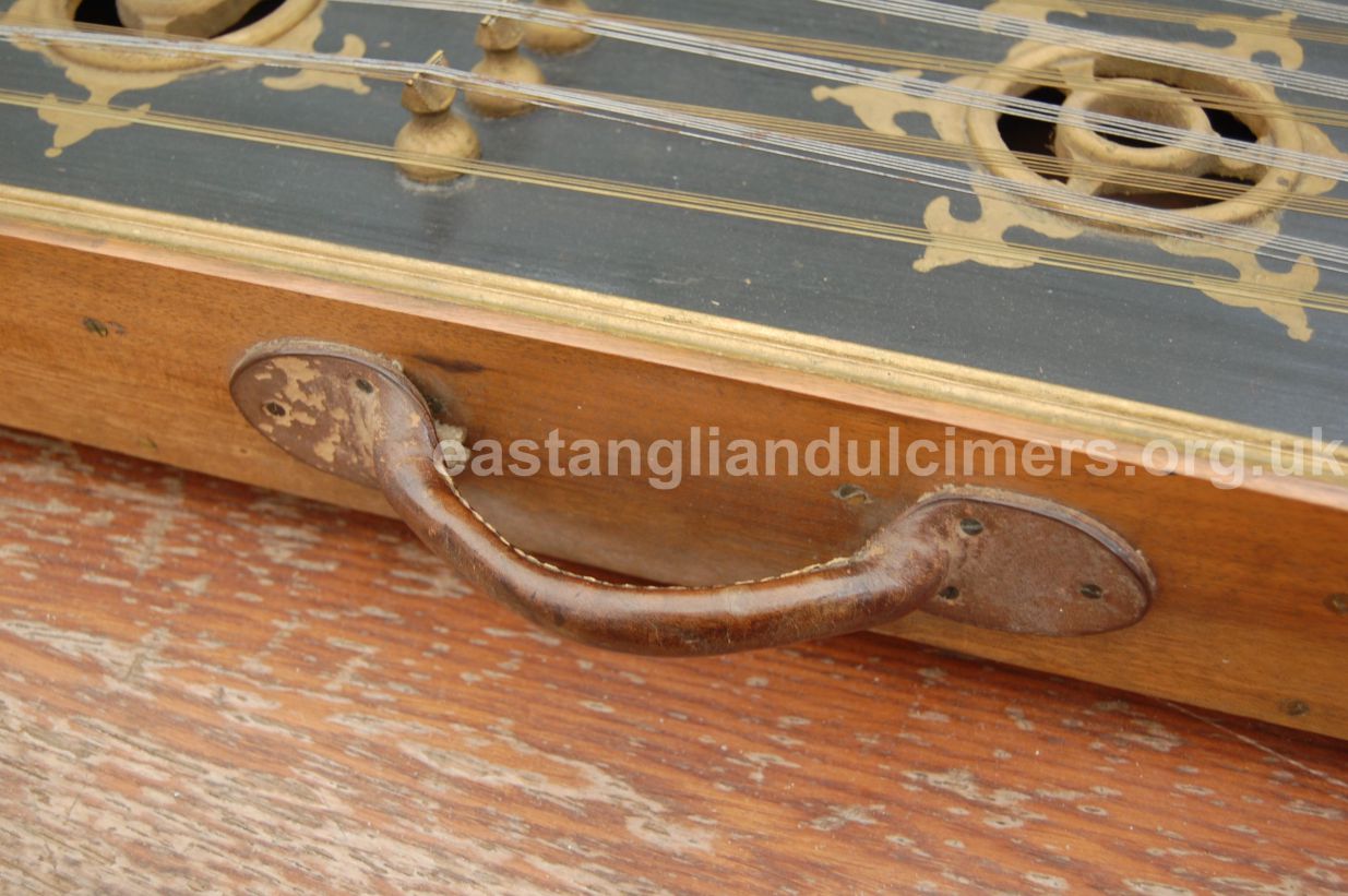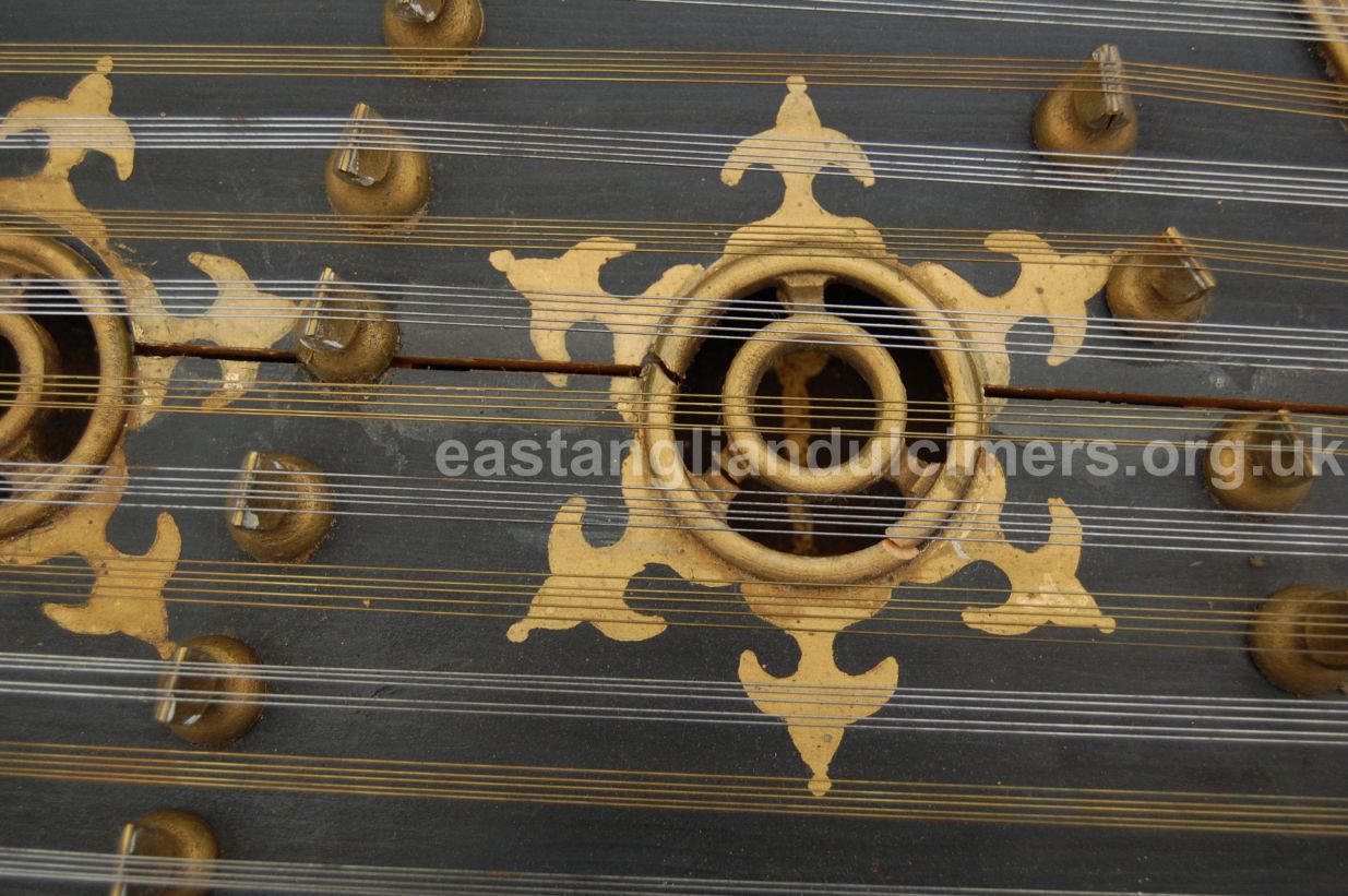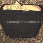 Ernest Parnell’s dulcimer is in good condition apart from a split across the soundboard, but it seems to be in a stable condition and is fully strung with 5 strings per course over 20 bridges, with treble bridges 5 and 6 being in the classic East Anglian offset position. There are four soundholes with the standard gilt decoration around them. It has an integral metal handle, four wooden feet but no stand, which he didn’t need as he played it on his lap, sitting cross-legged on the floor. In 2016 the dulcimer was still in family ownership, although not being played. His grandson had the original canes, and a case which Ernest had made himself.