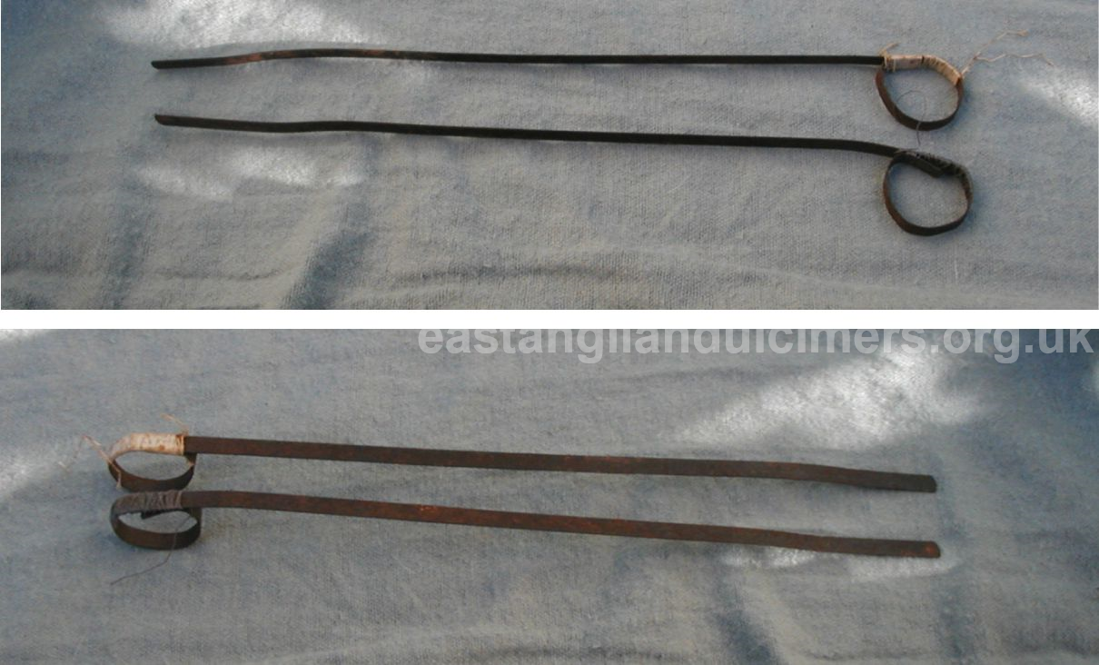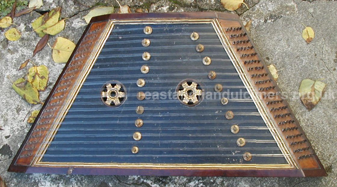 The instrument has 5 courses of strings over 20 bridges and two sound holes and is tuned in D. An original pair of beaters, made of metal and bound in cotton, came with the dulcimer.
