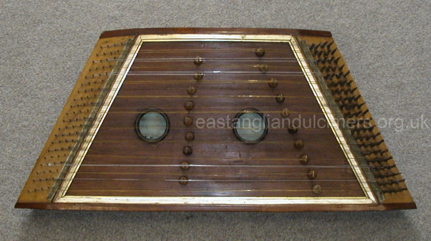 This photo of James Ellis was seen in the early 2000s, at which time it was held in the Strangers Hall Museum in Norwich. At the same time we also saw and photographed the dulcimers then held in store there, but neither of them matched the one in the Ellis photograph, as they both had four sound holes with gilt decoration around them (see Chris Self). There was another dulcimer then at Gressenhall Museum, Norfolk (and possibly at the Time & Tide Museum in Yarmouth later), which is probably the Ellis instrument as it has a plain top, 20 bridges and two soundholes.