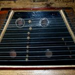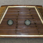 The photo above shows James Ellis’ dulcimer to have been fairly plain looking, with two soundholes and 20 visible bridges. He seems to have a specially-designed table with barley twist legs, and a shelf at the front which held his cane beaters and other accessories. From the angle at which the dulcimer sits it looks as though the table had an inbuilt device to hold the dulcimer at a good playing angle.