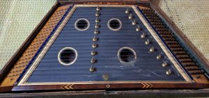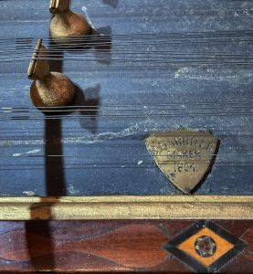The dulcimer has five strings to a course over 21 bridges, of which the lowest treble one is missing. It has been restored with the treble bridges placed in a straight line. It has simple gilt decoration but quite complex marquetry top and bottom and a shield-shaped plaque bearing the maker’s name (J. Harrold) and the year 1894.