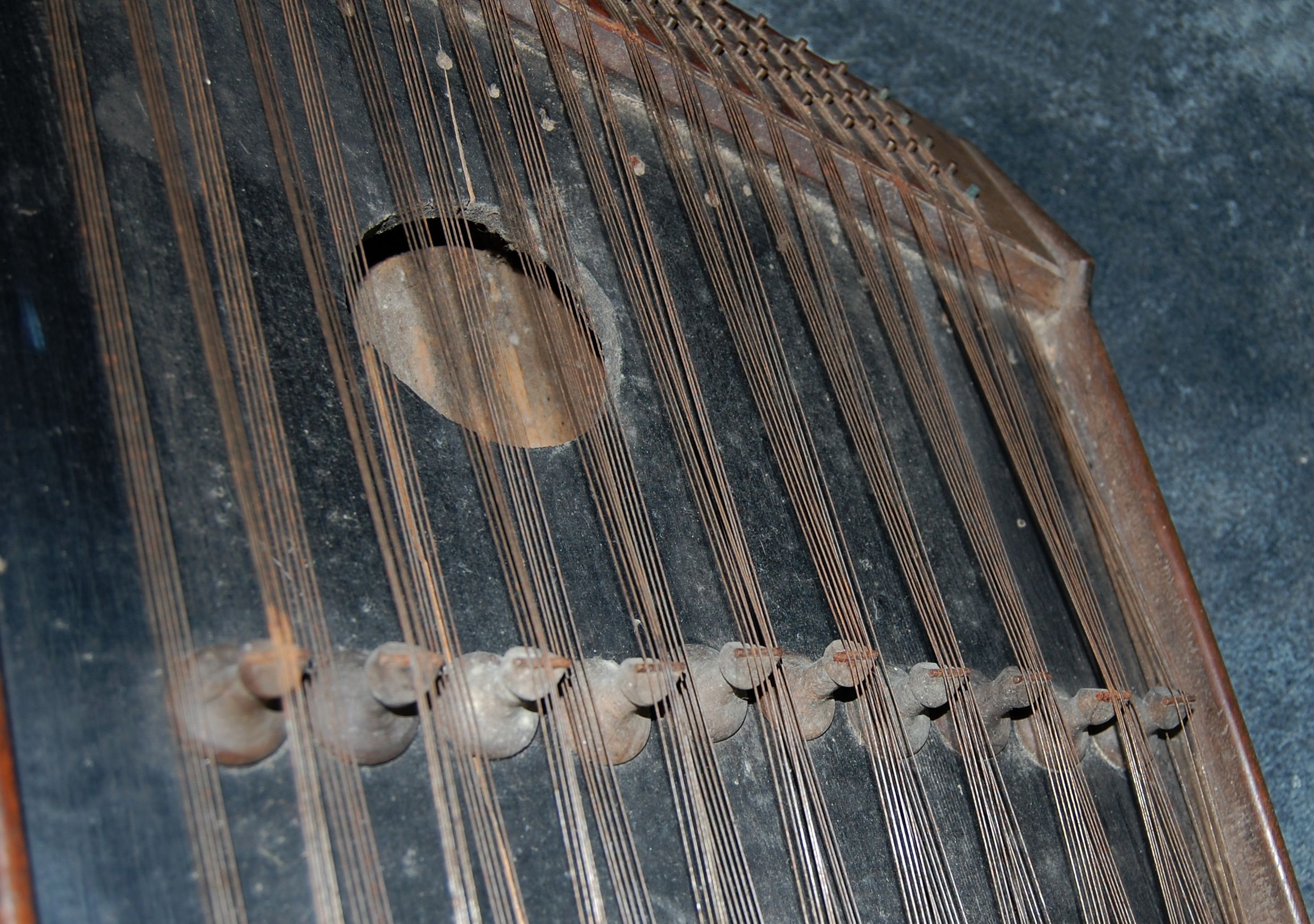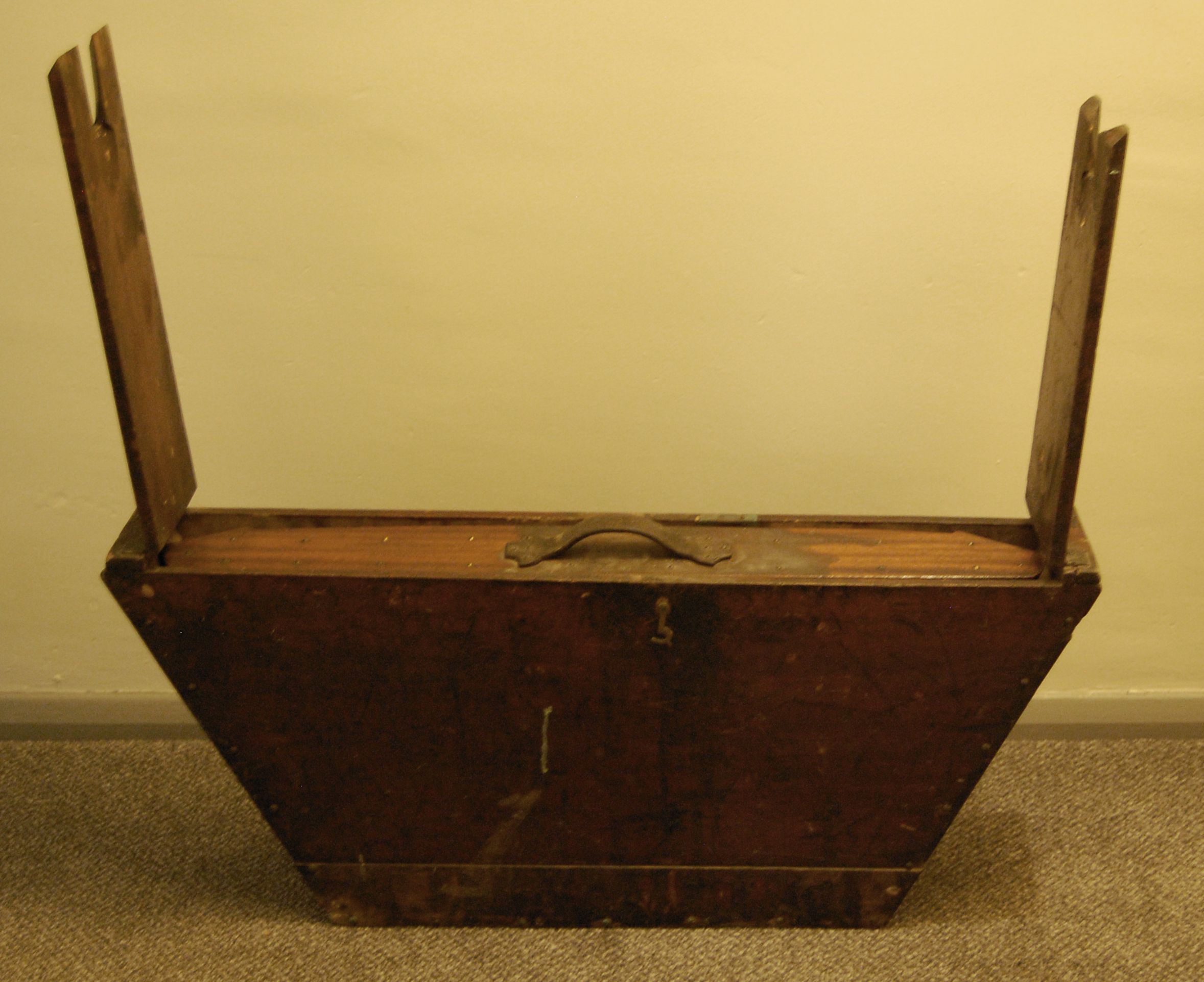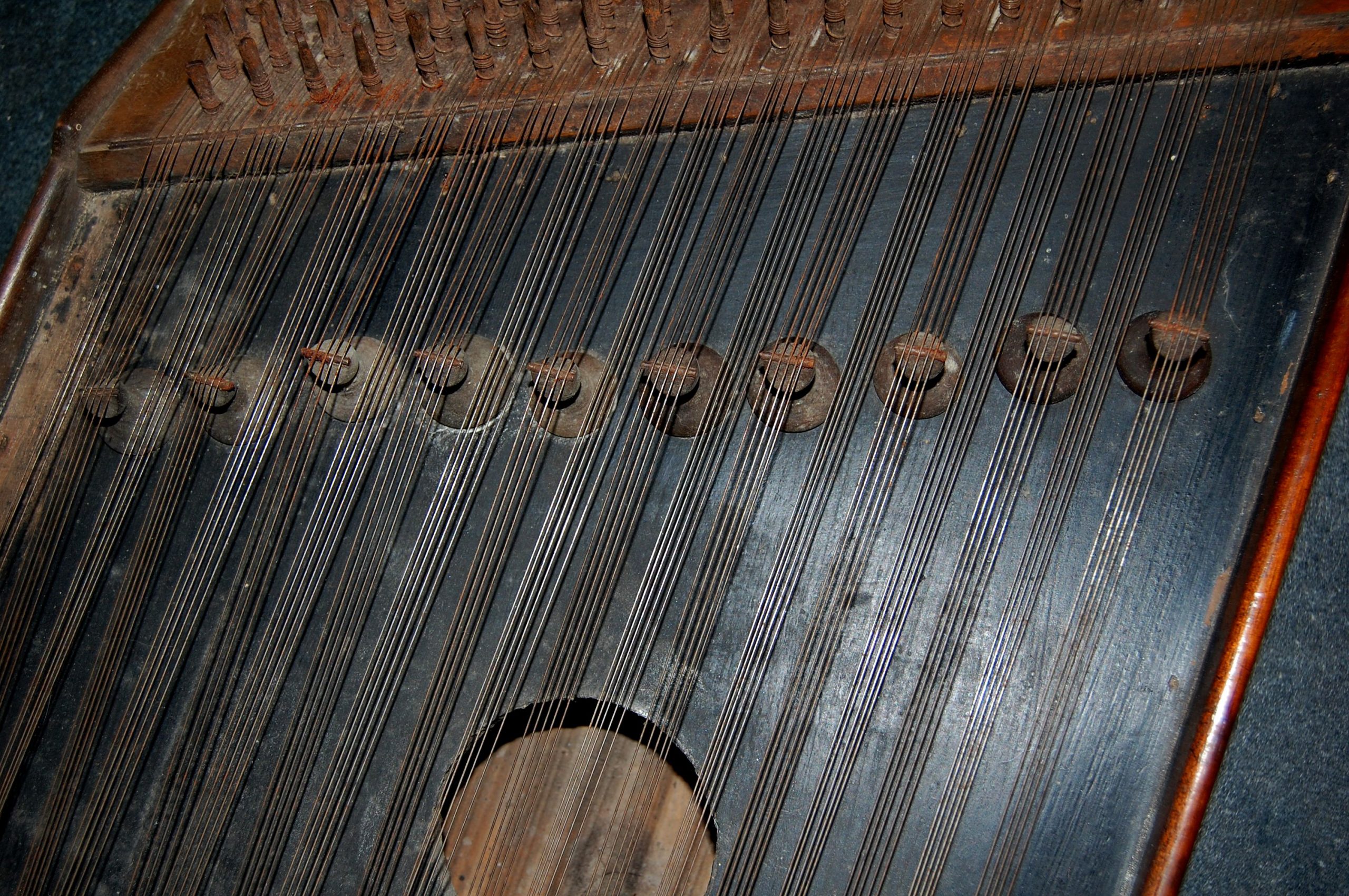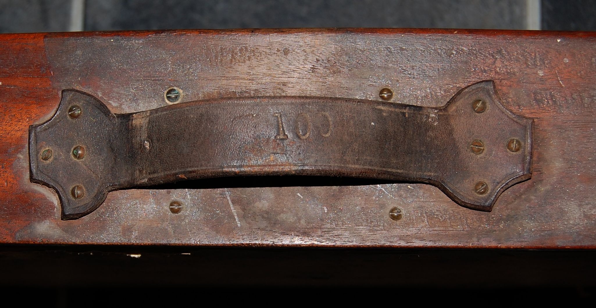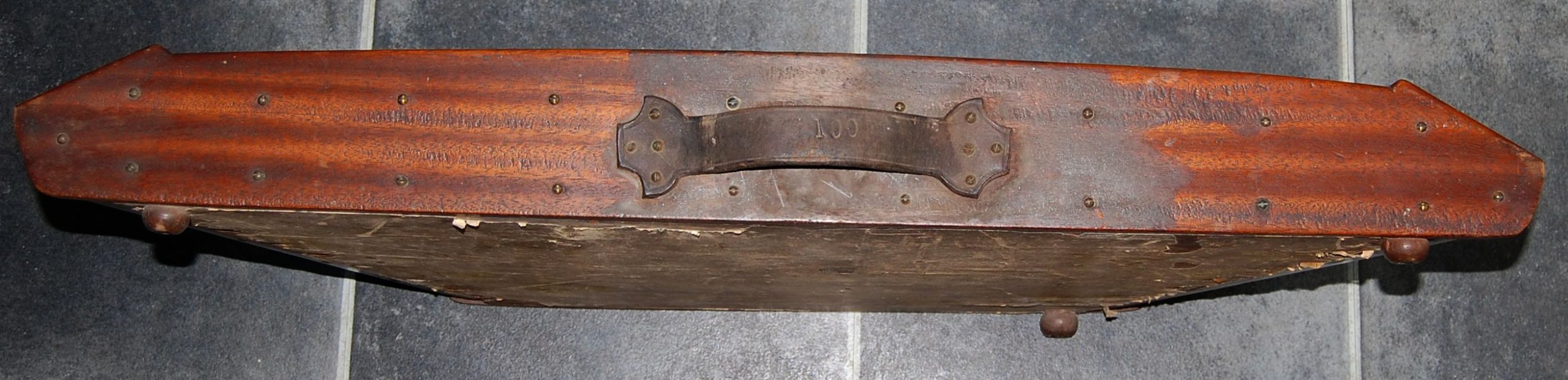 The dulcimer is quite small, with a plain black top, two soundholes with no inserts and 20 chessmen bridges with 5 strings per course. All the bridges and most of the wires are present, but the instrument is badly out of tune. The pegs are flat, suggesting an early date for manufacture (c.1850-1870). A tuning key and a pair of cane beaters bound in wool and felt were with the instrument. One cane is bound in red wool, one in white, perhaps indicating which hand to hold them with. The instrument has an integral leather handle, very sturdily made, which is imprinted with the number 100 and possibly two letters afterwards, but these are illegible. The case has a distinctive opening mechanism, reminiscent of the design of a double-leaf bascule bridge. The dulcimer slides in through the longest edge and the two ends close, leaving a slot in the middle where the integral handle pokes through, and there are then two small latches to secure the case.