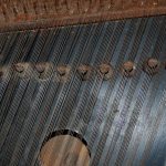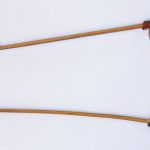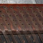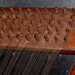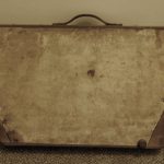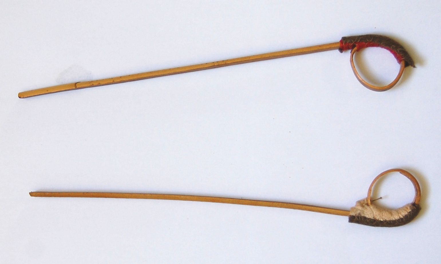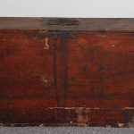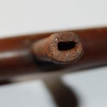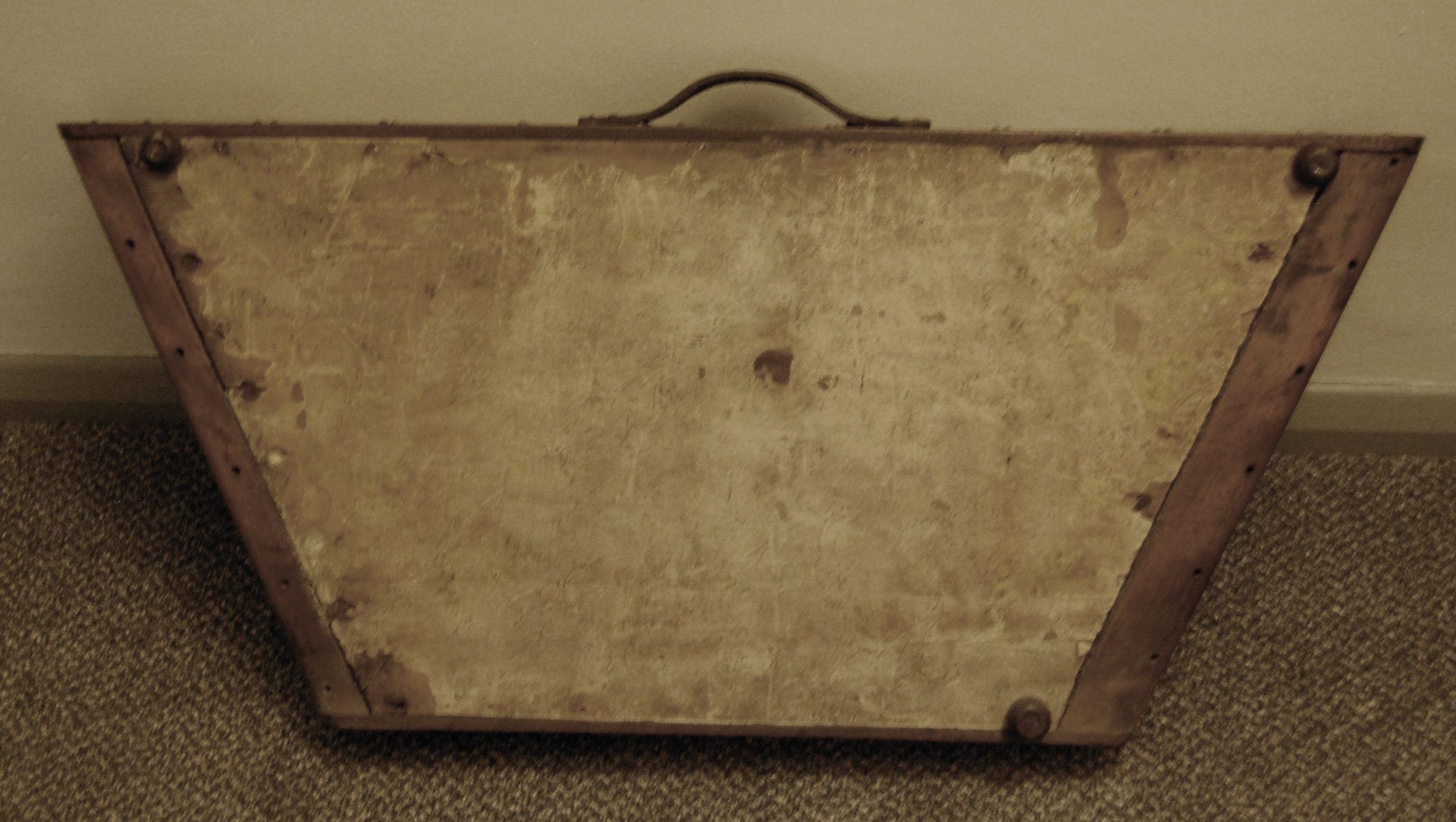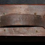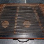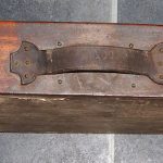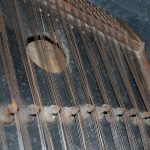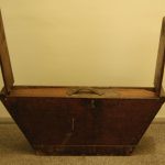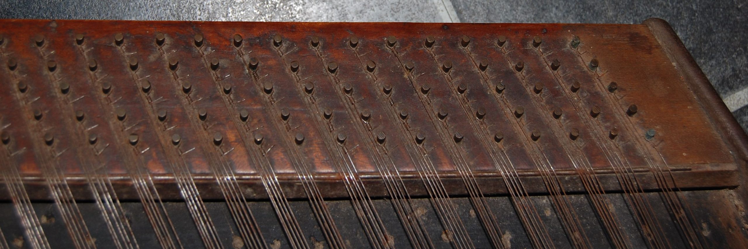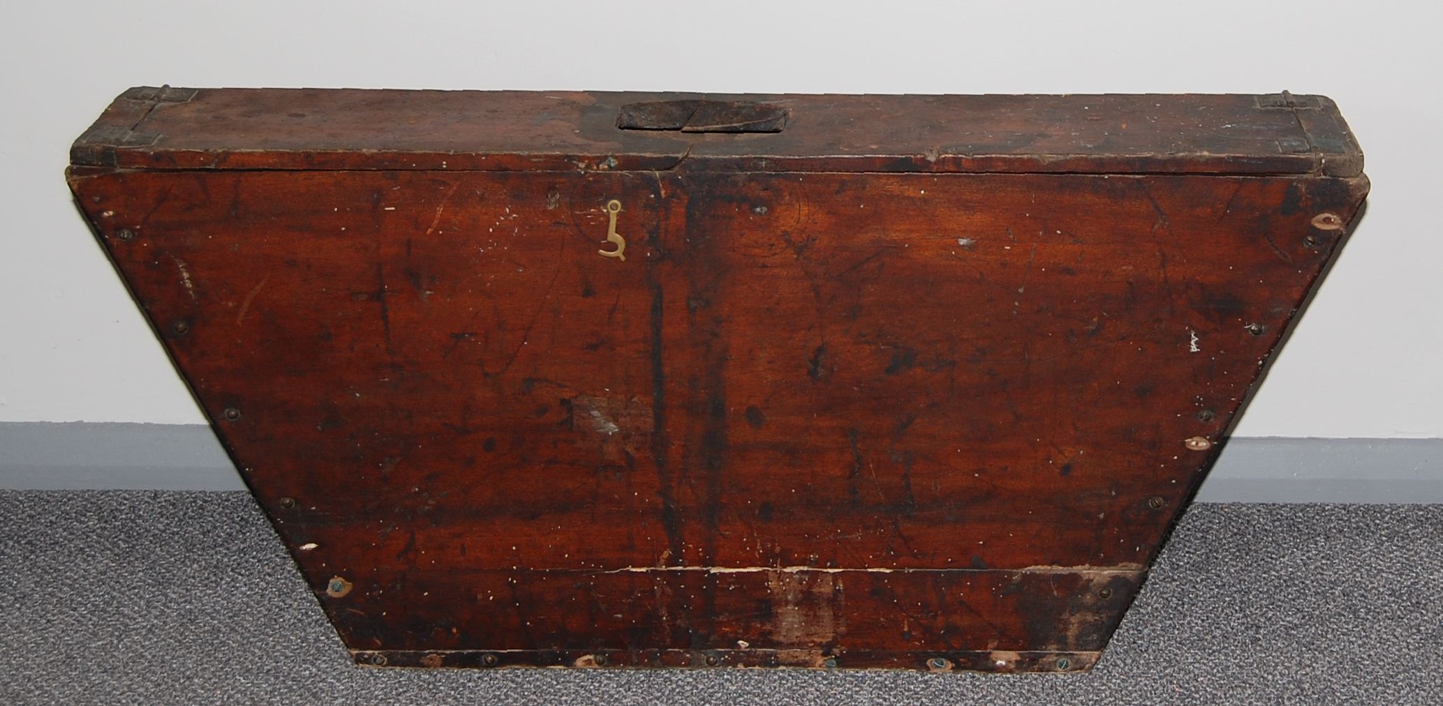 The dulcimer is quite small, with a plain black top, two soundholes with no inserts and 20 chessmen bridges with 5 strings per course. All the bridges and most of the wires are present, but the instrument is badly out of tune. The pegs are flat, suggesting an early date for manufacture (c.1850-1870). A tuning key and a pair of cane beaters bound in wool and felt were with the instrument. One cane is bound in red wool, one in white, perhaps indicating which hand to hold them with. The instrument has an integral leather handle, very sturdily made, which is imprinted with the number 100 and possibly two letters afterwards, but these are illegible. The case has a distinctive opening mechanism, reminiscent of the design of a double-leaf bascule bridge. The dulcimer slides in through the longest edge and the two ends close, leaving a slot in the middle where the integral handle pokes through, and there are then two small latches to secure the case.