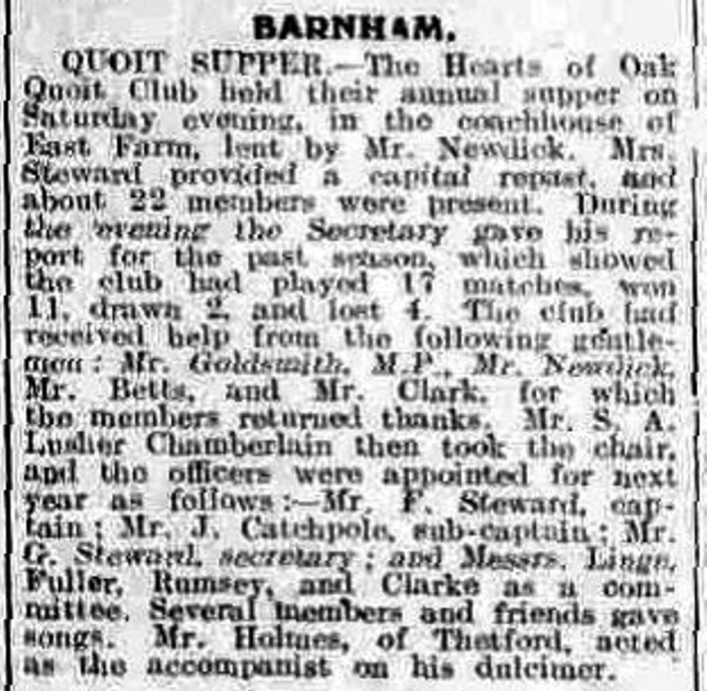 ‘Mr. Holmes from Thetford’ is mentioned in Norfolk newspapers in 1912 and 1913, playing for two private entertainments held at a large farmhouse in Barnham, hosted by J.S. Newdick; the first a Quoits Supper and the second a Harvest Horkey. On each occasion he was the accompanist for singing.