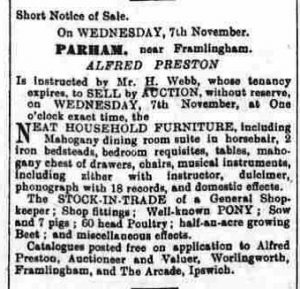 In November 1906, the Framlingham Weekly News carried an advertisement for a sale of household furniture and effects in the nearby village of Parham.
