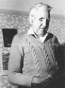Later the family moved to Northrepps and Walter continued playing, often in the Foundry Arms, through the 1940s. Following an injury when kicked in the face by a horse, Walter lost sight in one eye and was also partially deaf, but it didn’t spoil his enthusiasm for playing music. He was never keen to teach any of his children to play, although his son Jimmy would often accompany him on the bones. He and Jimmy travelled to pubs such as the Vernon Arms in Southrepps and the Albion in Cromer, where there was always stepdancing, music and singing. Walter sang comic songs in the pubs, but never played for dancing in village halls, considering that to be the preserve of bigger bands. Several recordings were made in these areas in the 1950s, and in 1958 Russell Wortley recorded Walter’s playing several stepdance tunes and some song tunes.