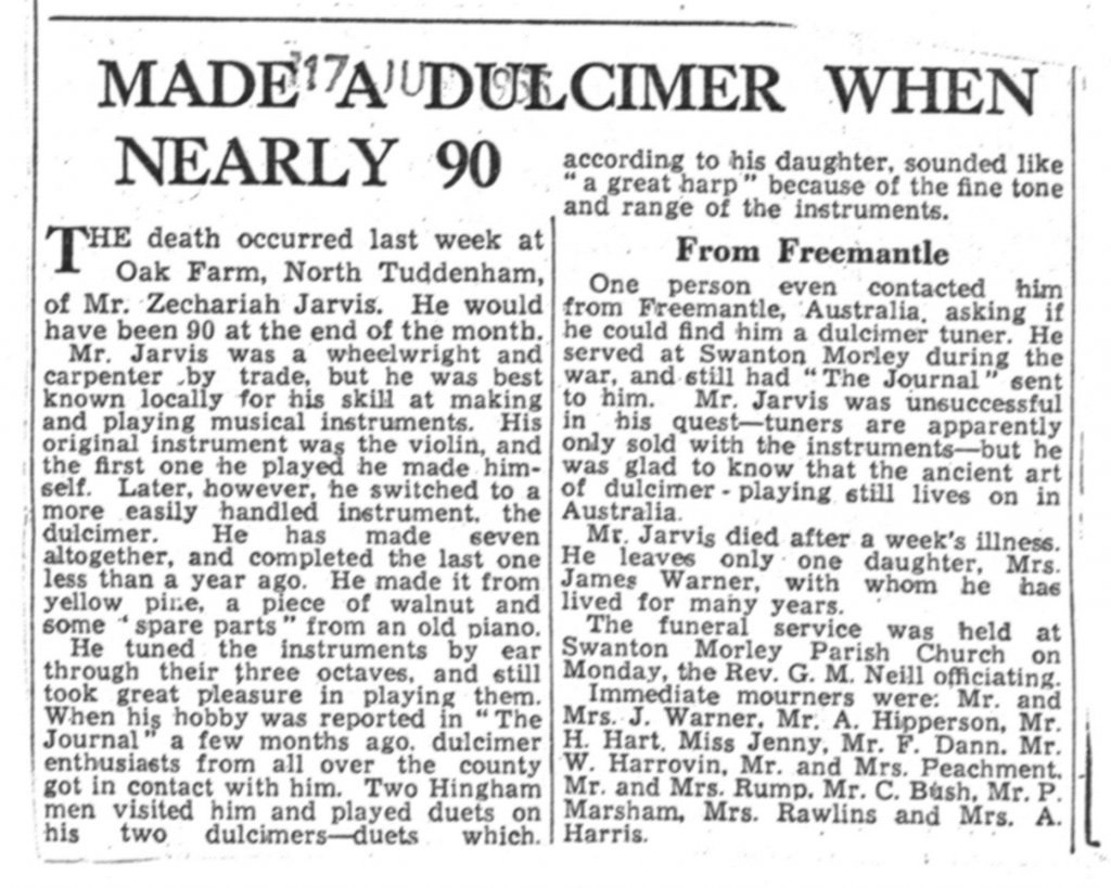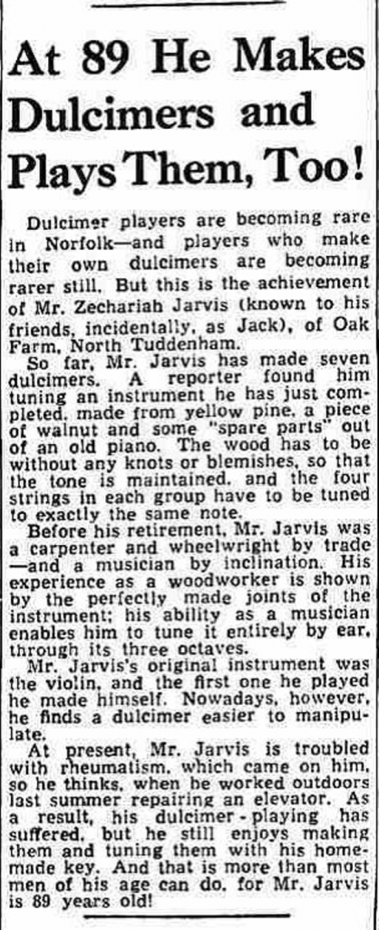 More details of Zephaniah’s life are known from two articles in the The Journal (the Dereham and Fakenham Times) from 10th December 1954 and 17th June 1955, the latter being an obituary. The articles state that he had made seven dulcimers, the last one quite recently. He was evidently well known in the area as a musician, originally playing the violin (he made his first one himself) and then going on to the dulcimer. His last dulcimer was described as being made from ‘yellow pine, a piece of walnut and some spare parts from an old piano’. From the 1954 article we also know that his dulcimers had four strings per course, and that he was usually known as Jack.